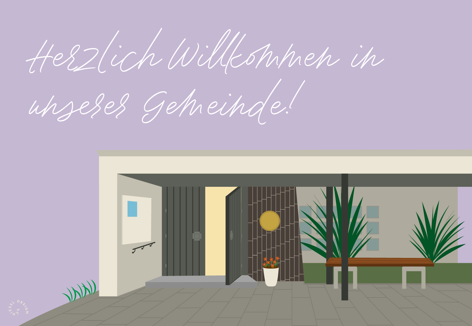 Die Idee zur Gestaltung dieser Karte kam durch den Gedanken, wie schön es doch ist, einen Ort in der neuen Heimat zu haben, bei dem die Türe für einen IMMER offen steht. Mit viel Liebe zum Detail habe ich den Eingangsbereich des Kirchengebäudes in Adobe Illustrator (iPad) illustriert. Der zarte lila Hintergrund soll die Evangelische Kirche repräsentieren. Mir war es wichtig, eine Karte zu gestalten, die sowohl ältere Gemeindemitglieder als auch junge Leute/Familien anspricht.